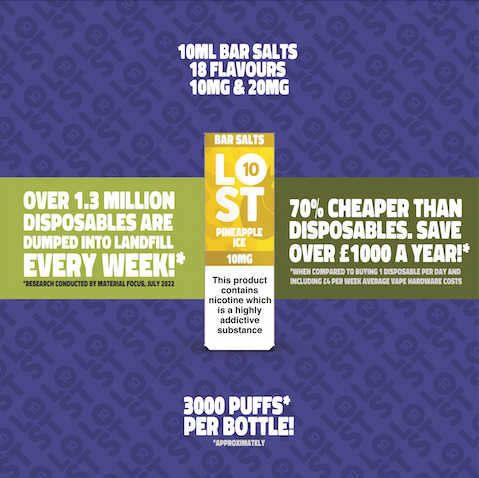 Lost10 Nicotine Salts are available in 5mg, 10mg & 20mg Nicotine Salt strength, helping you to cut down or change your nicotine intake.